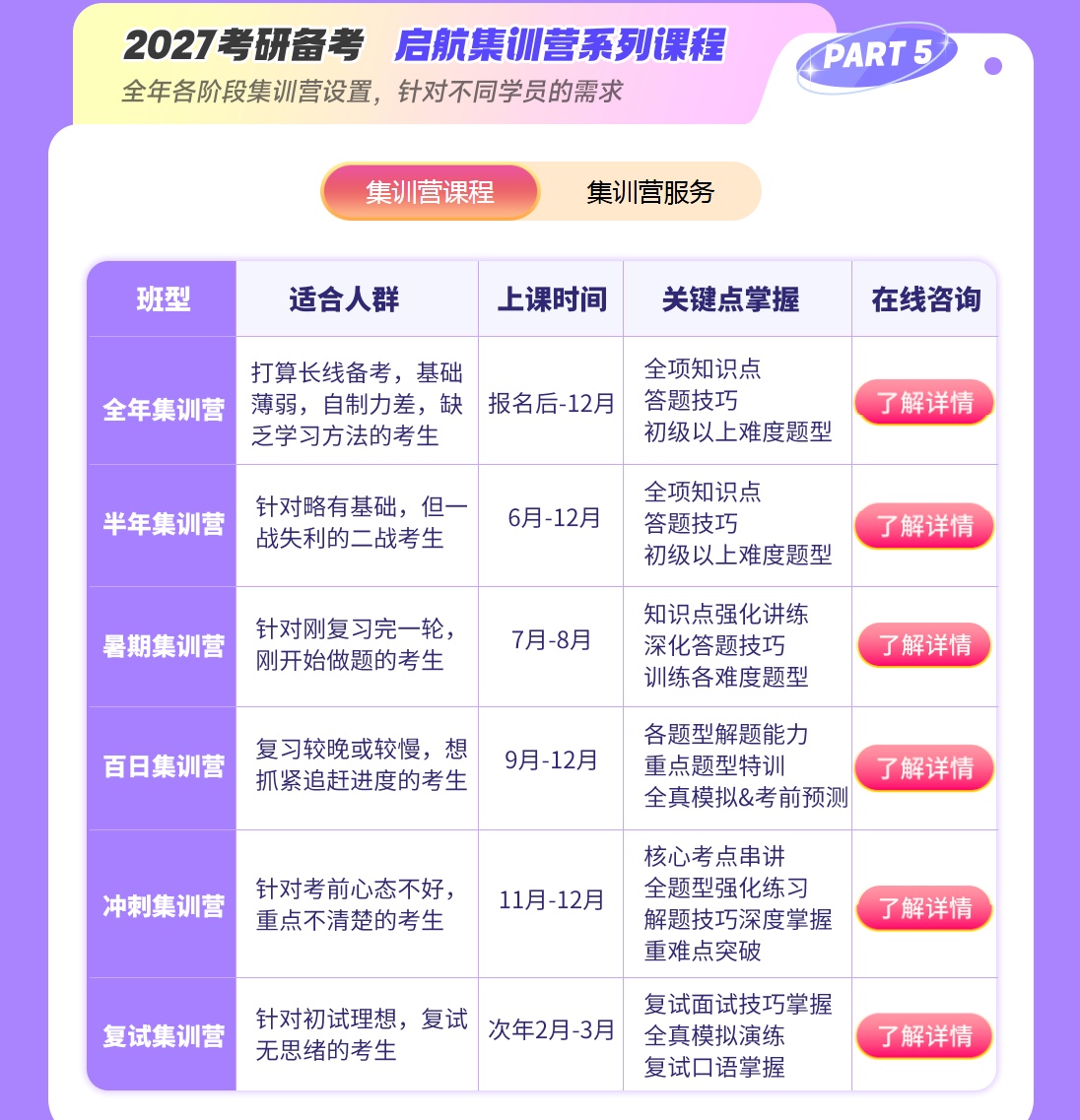 提供"三师伴学"(主讲+教辅+学管)模式,包含心理辅导、择校规划、复试指导等一站式服务。集训营内设休闲区、背书室、健身房等设施,平衡学习与生活需求。
